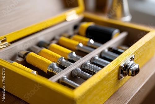 Naklejka premium An open yellow wooden box reveals a collection of screwdrivers with textured yellow and silver handles neatly organized