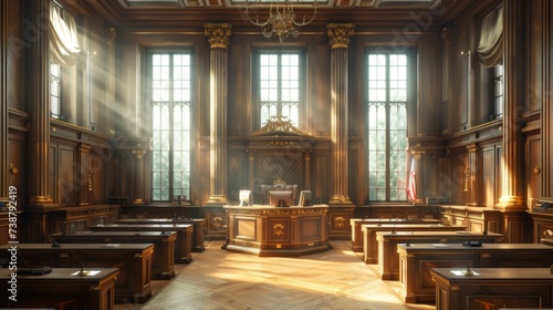Fototapeta premium An opulent courtroom with wooden paneling, a judge's bench, sunlight...