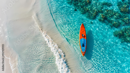 © Akharadat, Fototapeta premium An orange and blue paddleboard on the beach, a bird's eye view, high definition photography, clean white sand, clear turquoise sea water, waves lapping at shore edge, and a sense of calmness.