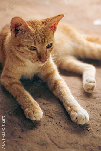 Obraz premium An orange cat lying on the floor, appearing relaxed yet alert, with its paws stretched forward