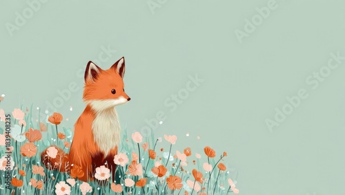 © Anastasiia, Obraz premium An orange fox sits among pastel pink and peach flowers in a soft green field. Concept Orange Fox Portrait, Pastel Pink & Peach Flowers, Soft Green Meadow, Wildlife in Bloom, Serene Nature Scene