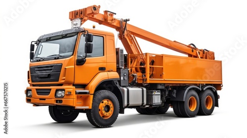 Fototapeta premium an orange truck with a crane, isolated on a clean white background,...