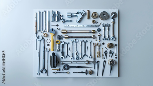 © Nasreen, Fototapeta premium An orderly square of modern mechanical tools on a white canvas.