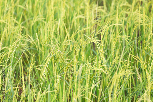 © ijetdo, Obraz premium An organic asian golden rice farm during the sun set in the countryside of Thailand.