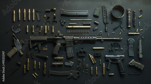 Fototapeta premium An organized spread of firearm parts and ammunition set against a dark background, highlighting the mechanical and tactical aspects of modern weaponry.