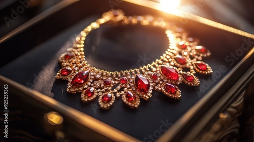 Fototapeta premium An ornate red and gold necklace lying in a display box, with light softly...