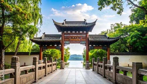 © Hersa, Fototapeta premium An ornately decorated archway with a tiled roof and intricate details stands as an entryway to a serene waterscape with a mountain visible in the distance. Lush green foliage frames the archway