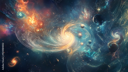 Naklejka premium 2. An otherworldly scene of swirling particles and luminous orbs in a cosmic...