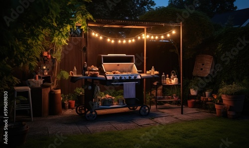 © Anna, Naklejka premium an outdoor grill with lights strung over it and a grill on wheels. generative ai