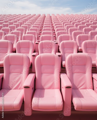 Fototapeta premium An outdoor open-air theater featuring multiple rows of pink seats, stretching under a clear blue sky, providing a unique and colorful seating arrangement for an outdoor experience.