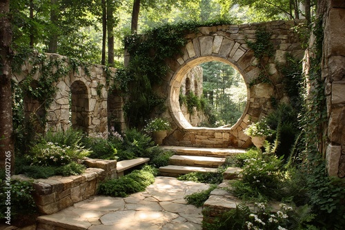 © Hasnain, Obraz premium An outdoor stone structure with steps leading into a garden area is captured.