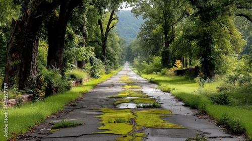 Fototapeta premium An overgrown abandoned highway with trees growing through the asphalt, wild...