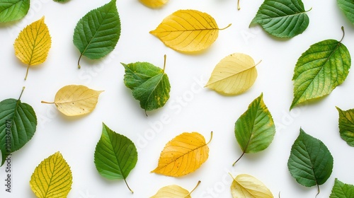 Obraz premium An overhead shot of green and yellow leaves scattered on a white background,...