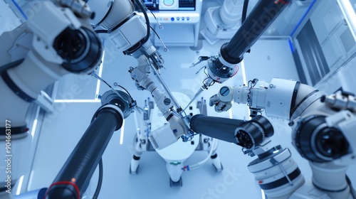 Fototapeta premium An overhead view of a robotic surgical suite, highlighting the precision and coordination of the robotic arms working in harmony.