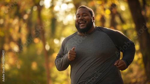© Evgenia, Obraz premium An overweight black man running in the park, wearing a long sleeve shirt with shorts and smiling at the camera
