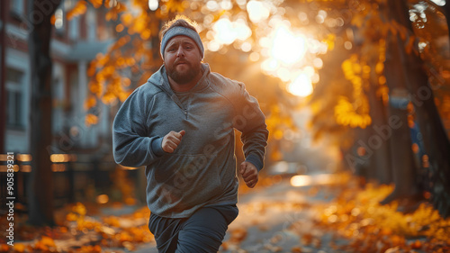 © Suralai, Obraz premium an overweight individual running, urban setting, focus on facial expression and movement,generative ai