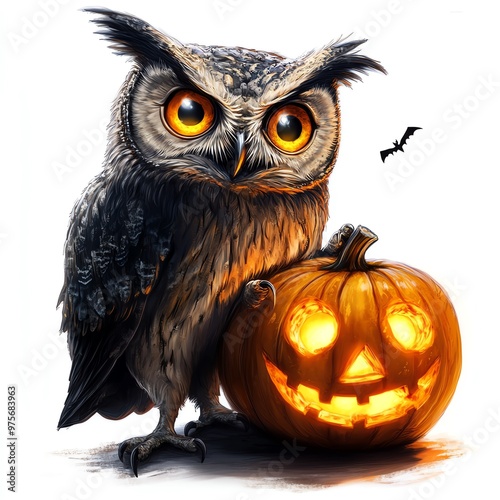 © Samaphon, Fototapeta premium An owl holding a glowing pumpkin lantern, Halloween theme, dark and spooky, isolated on white background
