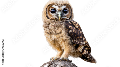 © PS Poppy, Naklejka premium An owl perched on a branch, with large golden eyes, soft feathers, and a calm expression. The background is completely transparent, showcasing the owl in full focus