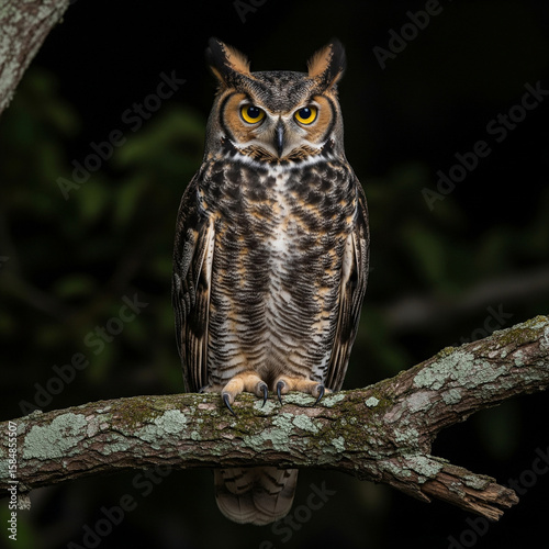 © Nur, Fototapeta premium An owl perched on a tree branch at night, staring forward.