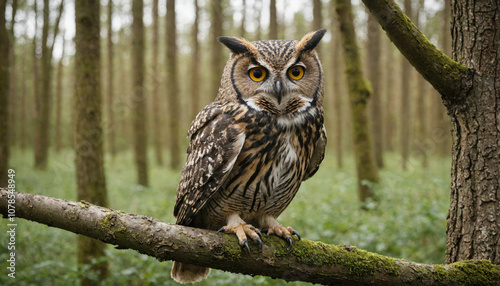 © Miklos, Obraz premium An owl perches on a branch in a dense forest, its yellow eyes piercing through the trees