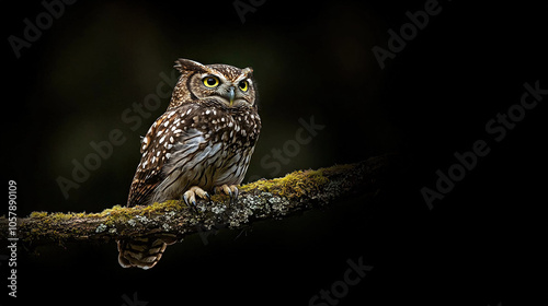 © Anna, Obraz premium An owl perches on a moss-covered branch, eyes wide open against a black background