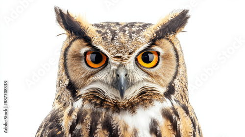 © Marcel, Fototapeta premium An owl with sharp focus on one vivid orange eye, while the rest of the face is blurred, set against a white background, creating an enigmatic and artistic photograph.