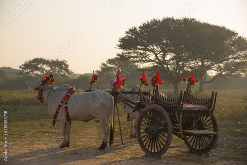 © Eak Ekkachai, Fototapeta premium An ox cart on dusty road at in Bagan, Myanmar, Sunrise, Sunset