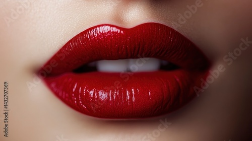 Obraz premium An ultra-close-up shot of perfectly shaped, plump, and soft lips, painted with a rich, glossy red lipstick