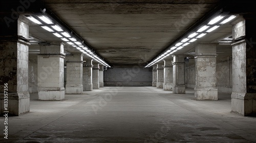 © Oleksandr, Fototapeta premium An underground parking area, the concrete floor is lit by artificial light. The concrete columns and the raw concrete ceiling create a functional aesthetic, urban space.