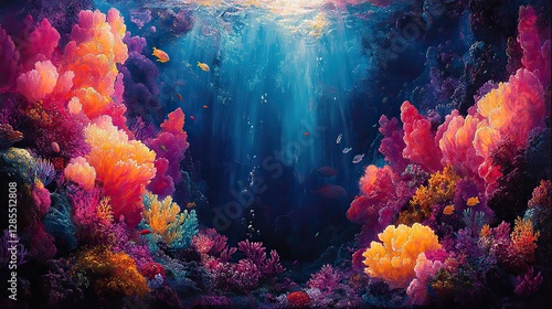 © Sang, Obraz premium An underwater abstract art piece featuring a vibrant coral reef teeming with colorful fish