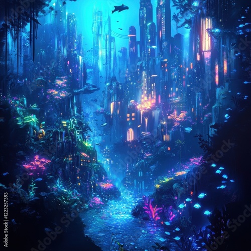 Obraz premium An Underwater City Illuminated By Bioluminescent Flora