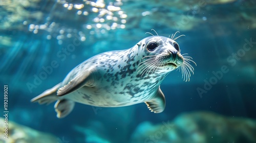 Fototapeta premium An underwater close-up of a young harbor seal swimming gracefully in clear...