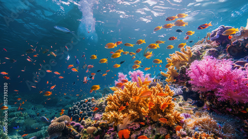 Fototapeta premium An underwater coral garden brimming with life, featuring soft corals swaying...