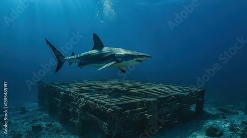 Fototapeta premium An underwater image of a shark swimming near a structure