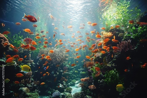 © Color, Naklejka premium An underwater paradise with schools of vibrant orange fish swimming among coral reefs and lush green aquatic plants, bathed in sunlight.
