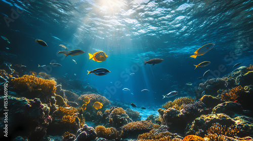 Naklejka premium An underwater perspective showcasing various species of fish and corals...