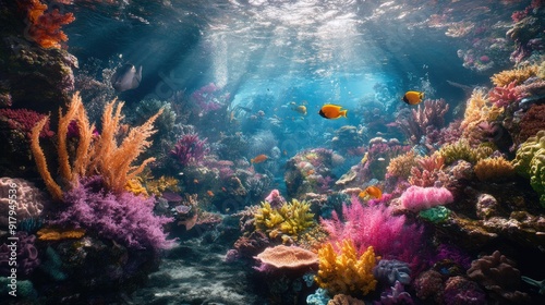 © Theeranan, Naklejka premium An underwater scene featuring a coral reef and a variety of exotic sea life, creating a dynamic and colorful landscape.