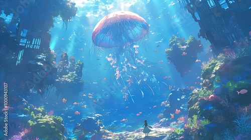 Fototapeta premium An underwater scene featuring a massive, luminous jellyfish surrounded by...