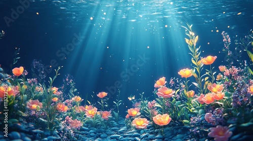 Naklejka premium An underwater scene filled with colorful flowers and gentle light rays.