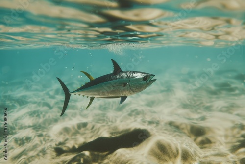 Fototapeta premium An underwater scene showcases a sleek, silver fish gliding effortlessly,...