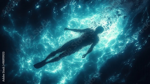 © Pixel Mind, Fototapeta premium An underwater silhouette of a swimmer seen from below They are swimming through the glimmering blue light of the ocean creating a serene ethereal effect on the water surface