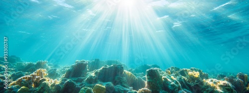 Naklejka premium An underwater view of a coral reef with sunlight streaming through the water's surface (Repeating water's surface is redundant, so I removed it