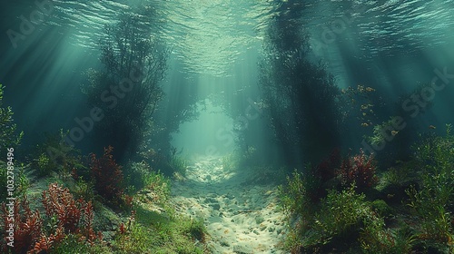Fototapeta premium An underwater view of a dirt path surrounded by seaweed and sunlight streaming through the water