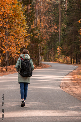 Fototapeta premium An unrecognizable female traveler enjoys a journey walking along a winding forest road.