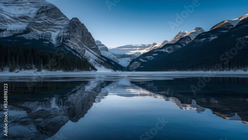 Fototapeta premium An untouched icy lake reflecting high snowy mountains.