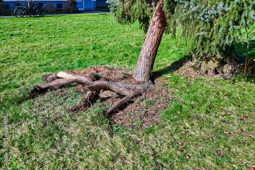 Fototapeta premium An uprooted and crooked coniferous tree after a heavy storm.