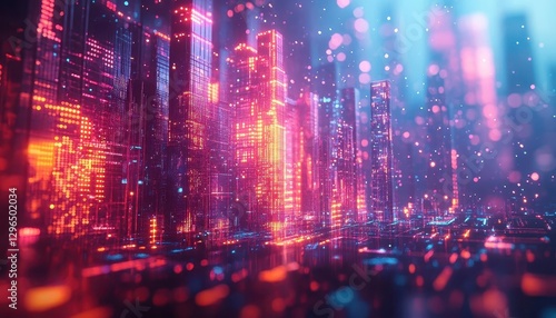 Obraz premium An urban landscape with glowing holographic buildings and neon-lit streets,...