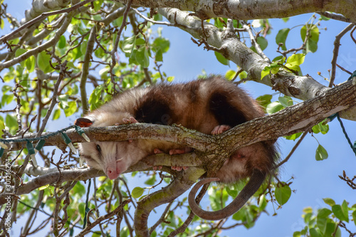 © Joanne Dale, Fototapeta premium An urban opossum bares his teeth at crowd forming below his resting place in a tree in Fernandina Beach, Florida.