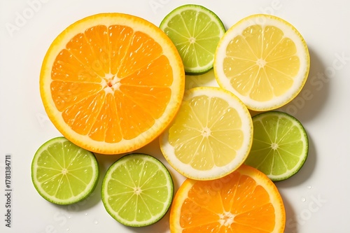Fototapeta premium An vibrant assortment of citrus slices creates a refreshing and colorful flat lay display on white.
