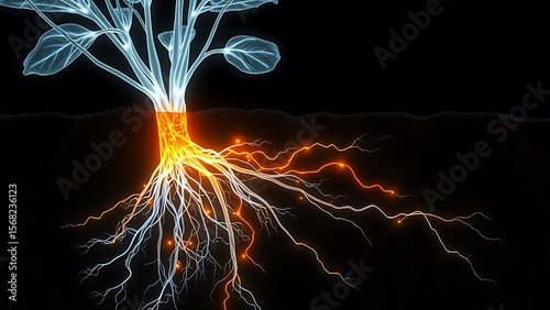 © Leo, Obraz premium An X-ray view of plant roots unveiling a hidden glowing network weaving through the soil.